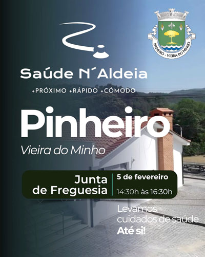 A Junta de Freguesia de Pinheiro vai disponibilizar, a partir do dia 5 de Fevereiro, e de 4 em 4 semanas, uma equipa de saúde, composta por médico(a) e enfermeiro(a), para o acompanhar em diversas situações de saúde - um serviço público e gratuito, intitulado “Saúde N’Aldeia”.